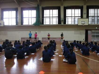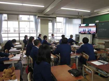 部活動紹介に参加しない2・3年生は,Zoomによって配信されてくる体育館の様子を,各教室で視聴しました。大きなテレビ画面に映し出された仲間の説明やパフォーマンを,2・3年生は熱心に視聴し,時折,快い拍手が起こっていました。