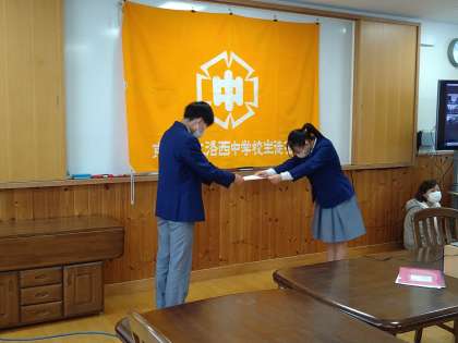 4月19日(月)6時間目,前期学級委員の認証式を行いました。ランチルームに生徒会役員と学級委員の代表生徒5名が集まり,各委員長から代表生徒に認証書が渡されました。代表以外の学級委員生徒へは,教室で担任の先生から認証書が渡されました。写真は,上から評議員,環境委員,文化委員へ,副会長並びに委員長から認証書を渡しているところです。
