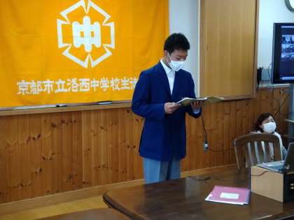 続いて,体育委員と図書委員の代表生徒に,委員長から認証書が手渡されました。最後に生徒会長より「洛西中学校の主役は私たち全校生徒です。委員会に入っていない人も,洛西中学校をより良くするために,委員の人を支えてくれると嬉しいです。各委員会への協力をよろしくお願いします。」とのあいさつがあり,認証式を終えました。学級委員の人たちではなく,生徒ひとりひとりが,洛西中学校の発展に貢献してくれることを期待します。