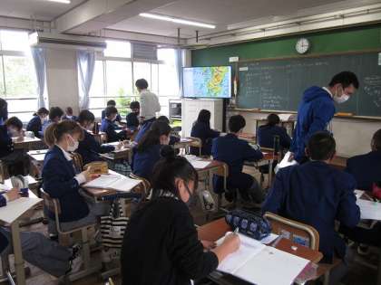 引き続き,5月13日(木)の授業の様子をお伝えします。写真1は,3年生男子の体育の授業で,ブリッジをしているところです。本日はグラウンドが雨でぬかるんでいたので,室内で「ストレッチ,柔軟,体つくり,トレーニング」に取り組んでいました。写真2は,2年生の社会の授業で,九州地方の自然環境の特色について調べていました。ティームティーチングの先生に質問している場面もありました。写真3は,1年生の技術の授業で,木材の3つの性質を知ることを目標に取り組んでいました。木材は水を吸収すると反りが起こることを,実験で確かめていました。