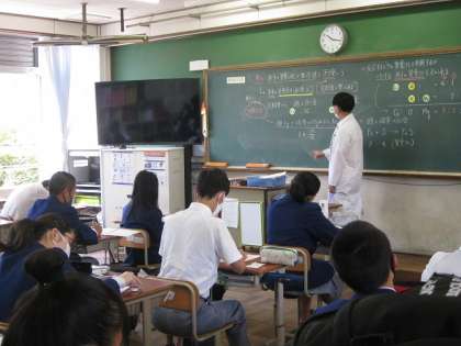 6月1日(火)の授業の様子を抜粋してお伝えします。写真1は,3年生の社会の授業で,自分の考えをワークシートに書いた後,タブレット端末(ロイロノート)を活用して,仲間の考えを共有していました。写真2は,2年生の理科の授業で,原子の質量を比で表した値を原子量といい,原子量を使うと化学反応に必要な物質の質量がわかることを学んでいました。写真3は,1年生の数学の授業で,乗法の交換法則と結合法則について学んだ後,練習問題に取り組んでいました。
