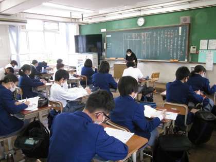 6月7日(月)の授業の様子を抜粋してお伝えします。写真1は,1年生の社会の授業で,世界の宗教についてタブレット端末を活用して調べ,ロイロノートにまとめていました。調べる内容は,各自が選択することになっており,キリスト教やイスラム教,仏教や神道,中にはゾロアスター教について調べている人がいました。最後に調べた内容を社会のフォルダに提出していました。写真2は,2年生の国語の授業で,「クマゼミ増加の原因を探る」を題材に,文章の構成を捉えることを目標に取り組んでいました。説明文の基本は三段落構成で,A序論(問題提起)B本論(具体的な説明)C結論(まとめ・主張)であることを学んだ後,さらに細かく見ていっていました。写真3は,3年生の音楽の授業で,「さくらさくら」を一曲とおして弾くことと,前奏の旋律を創作することを目標に,筝の練習に取り組んでいました。