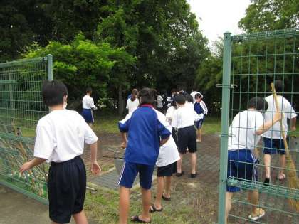 6月18日(金)1学期期末テストの最終日,午後から評議・専門委員会の皆さんと教職員とで,プール清掃を行いました。昨年度はコロナ禍のため,水泳が中止になりましたので,2年間の汚れが溜まっていました。図書委員会が更衣室の掃除を,環境委員会がプールサイドの落ち葉の掃除を,それぞれ担当してくれました。そして,評議会と体育委員会・文化委員会とが,プール内の掃除を担当してくれました。まず,トンボで泥を上手から下手へ追いやり,下手でその泥をシャベルですくいバケツに入れ,リレー形式で泥の入ったバケツを運び,所定の位置に捨てました。かなりの重労働でしたが,皆さんが主体的に取り組んでくれましたので,想定よりも速い時間で,プールから泥がなくなりました。その後,バケツとデッキブラシを持って,プールの底や壁,またプールサイドを磨いてくれました。皆さんの努力のおかげで,プールがきれいになりました。本当にありがとうございました。