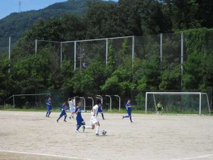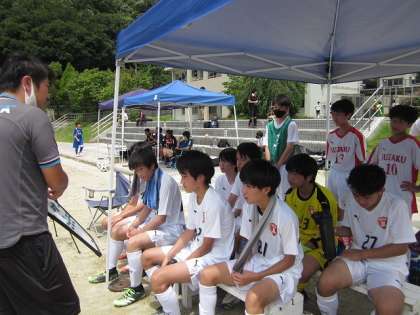 7月17日(土)大枝中学校において,サッカーの夏季大会1回戦が行われました。対戦相手は春日丘中学校でした。開始早々から,中盤でのボールの奪い合いをよく制し,前線にボールを運び,チャンスをつくっていました。前半20分,右からのセンタリングにうまく頭で合わせて,待望の先取点を取りました。ハーフタイムでは,作戦版を使って,フォーメーションを確認し,後半戦に臨みました。開始から5分,右サイドを駆け上がって,シュートを放つと,見事に枠を捉え2点目が入りました。メンバー交代して入った選手も,よく走って活躍していました。そして,後半15分に追加の1点を,その後,ダメ押しの4点目をあげて快勝しました。前・後半を通じて,ゴールキーパーがよく声をかけ,ディフェンス面で隙を与えませんでした。次もこの調子で頑張ってくれることを期待しています。