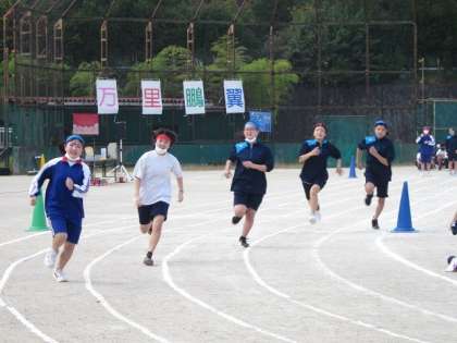 2年生は開会式に引き続いて,100走に臨みました。女子から始まりましたが,いい表情で自分の持てる力を発揮しようと一生懸命走っていました。男子の最終レースでは,3組の担任の先生が飛び入り参加し,最後まで接戦を繰り広げていましたが,生徒の方が一枚上手でした。ハードル走は,体育の時間の練習の成果を発揮しようと頑張っていました。