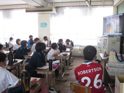 3限目,1年生は各クラスで総合的な学習の時間の映像鑑賞を行いました。「福祉のまち洛西」と題して,自分たちの仲間が発表しているの様子,2年生の「東日本大震災に学ぶ」の津波の恐ろしさや「天国に繋がるただ一つの電話『風の電話』などを伝えた映像,そして,3年生の劇とアニメと本物の映像を組み合した質の高い『夏雲』を視聴しました。