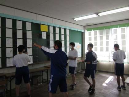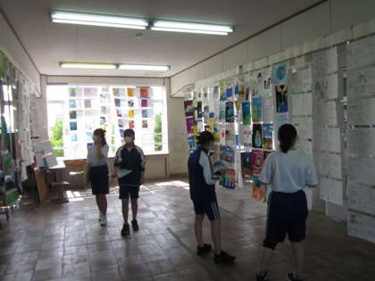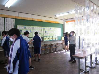 3限目,3年生は展示鑑賞を行いました。3年国語科展では,自分たちの仲間の作品を鑑賞しているところを,RCVの方に撮影していただきました。美術科展では1〜3年生の力作を鑑賞しました。英語科展では,1・2年生の後輩の作品に目が留まりました。