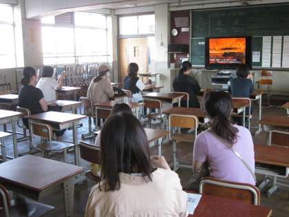 午後4時から,3年生の総合的な学習の時間の取組の一環として,「平和な世界をつくるために」と題した『夏雲』の映像発表会を行いました。「被ばく三世」の話で,「生徒が演じている画像」と「アニメの画像」と「戦争の実際の画像」を組み合わせた映像に,保護者の皆様も引き込まれるようにご覧になっていました。
