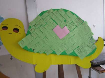 「学校祭体育の部・文化の部」を終えて,2年生のフロアには,「2年生向日葵畑にきっと花は咲く」と題して,総合的な学習の時間「東日本大震災に学ぶ」の展示作品が,貼り出されていました。また,学年で飼っているカメに因んで,生徒一人一人の強みを書いた付箋で,カメの甲羅を形作っていました。