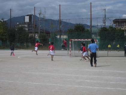 10月23日(土)午前11時30分から,松尾中学校において,「春の全国大会」京都市代表決定戦男子の部が行われました。対戦相手は下鴨中学校でした。円陣組んで,気合を入れて試合に臨みました。時間とともに体がほぐれてきて,練習通りの攻撃ができ,得点を重ねることができました。大きく点差をつけたところで,ハーフタイムを迎えました。後半も順調に得点を重ねたところで,1年生に出場の機会がおとずれました。思い切ってシュートをはなって得点する場面もありましたが,ディフェンスがあまくなり失点を重ねたところで,2年生と交代となりました。その後は着実に得点を重ね,危なげなく勝利しました。