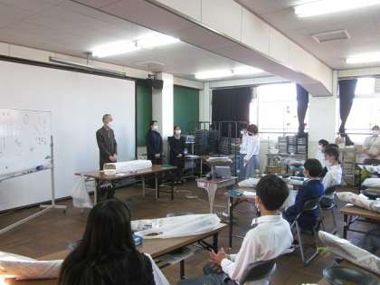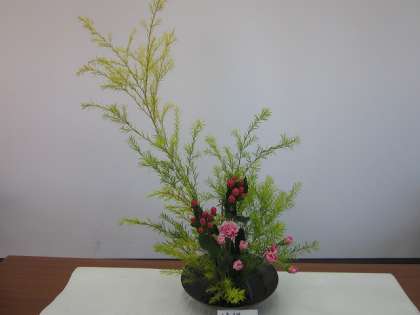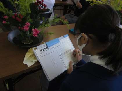 でき上がった生徒から,「華道体験」と題したワークシートの記入に取り組みました。「作品名」の欄には「華やかな色達」と,「華道体験への意気込み」の欄には「初めてだけど迫力のある生け花をしたいと思います。」と,そして「作品に込めた自分の想い(イメージしたこと)」の欄には,「迫力もありつつ,とても綺麗で美しいものを作ろうという思いを込めて作りました。」などと書いている生徒がいました。でき上がった生け花は,順番に写真を撮ってもらいました。その写真をワークシートの「作品名」の下に貼る予定です。最後にお世話なった草月流の先生方に,代表生徒が感謝を気持ちを伝えて,華道体験を終了しました。日本の伝統文化を知る本当に有意義な時間になりました。本日お世話になりました草月流の先生方に,この場をお借りしまして改めて厚く御礼申し上げます。