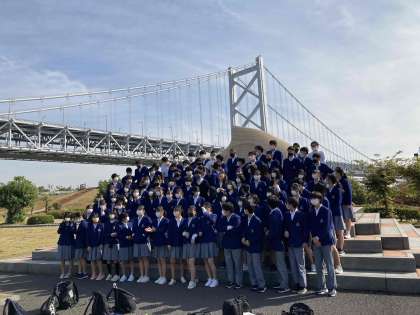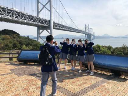 与島パーキングエリアの展望所から,瀬戸大橋を背景に学年全員の記念写真を撮りました。そのあとは,瀬戸大橋や瀬戸内海をバックにグループで写真を撮ったり,売店で買い物もしたようです。