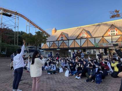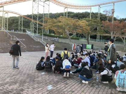 午後4時過ぎに,姫路セントラルパークのエントランス前で解団式を行いました。実行委員生徒の司会で,校長先生のあいさつ,添乗員さん・カメラマンさんへのお礼,諸注意等が続きました。次にクラス写真を撮りました。みんな満足そうな表情をしています。