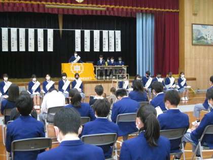 11月5日(金)5・6限に,生徒会役員選挙を実施しました。昨年度はすべてZoomを使って実施しましたが,今年度は2年生だけが体育館に入って,1・3年生はオンラインで教室で視聴しました。どの候補者も自分のスローガンを掲げて,しっかりに全校生徒に訴えかけていました。体育館で聞いている2年生は,自分たちの仲間の訴えを,メモを取りながらしっかり聞いていました。また,教室でZoomを視聴している1・3年生も,テレビ画面を見ながら,訴えをしっかり聞いていました。