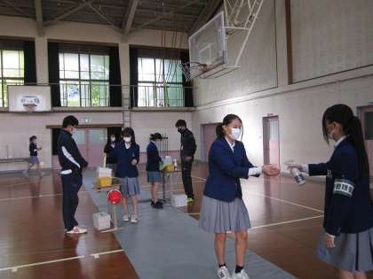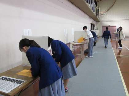 立会演説会終了後,選挙管理委員が投票の仕方を実演を交えて説明しました。それをZoomで1・3年生の教室に伝えました。体育館で聞いていた2年生から,指示通り投票に移りました。受付で投票用紙をもらい,記帳台で記入し,投票箱に入れて教室に戻りました。その間,選挙管理委員が各ポイントに立って,声かけや消毒作業を行ってくれました。今年度から選挙の仕組みを知ってもらおうと,実際の選挙をまねて実施ました。記帳台・投票箱を西京区選挙管理委員会にお借りしようと思いましたが,衆議院選挙の関係で今年度はかないませんでした。そこで,選挙管理委員会と教員とが,記帳台や投票箱を準備してくれました。初めて本格的な投票を行った生徒が多い中,貴重な学びになりました。このような取組が実って,選挙権を得たときには自分の思いを一票に託して,投票してくれることを願っています。