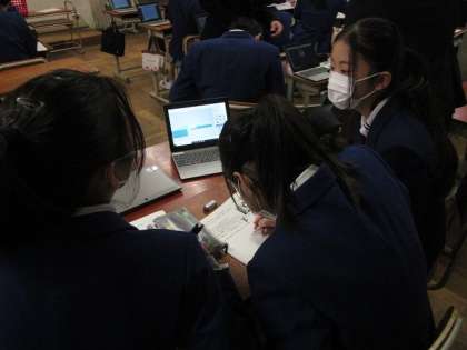 3年3組の数学では,日常の場面から,相似な三角形を見出し,校舎の影の長さを求めることで課題解決につなげることを目標に取り組んでいました。課題解決のために,影の長さが必要であることを全体で確認し,次に各自で太陽・校舎・ひまわりの位置関係を,タブレットの3Dの図を使って,ワークシートに図示しました。そして,影の長さを求めるために使う情報を3人グループで考え,解答を導き出していました。その後,全体でグループの考えを共有しました。