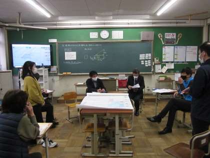 授業後,授業づくりにかかわったチームの教員で研究協議を行いました。成果や課題を書いた付箋を模造紙に貼って,協議を深めていきました。年齢や教科の違う先生方から,生徒に視点をおいて活発に意見が出されていました。より良い授業づくりを目指して,先生方の主体的で真摯な姿がありました。