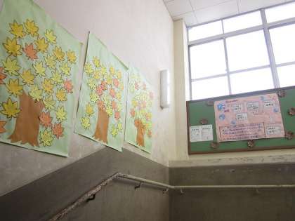 また,階段の壁には,紅葉をイメージした葉に,校外学習を振り返っての感想が書かれていました。中には,「みんなで協力し合ったウォークラリーが,心に残りました。」「学年レクでやったドッジボールが,みんなで協力して楽しくできたのでよかったです。」「この校外学習を通して,仲間との絆が深められました。アスレチックやウォークラリーでは,班の仲間と協力することで,より楽しく行動できました。」などと書いてありました。有意義な校外学習になって良かったですね。