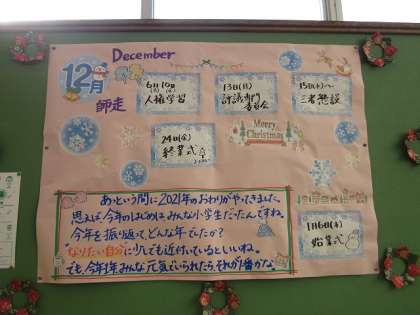 1年生のフロアに行く踊り場に,12月(師走)の掲示物がありました。そこには,「あっという間に2021年のおわりがやってきました。思えば,今年のはじめは,みんな小学生だったんですね。今年を振り返って,どんな年でしたか? “なりたい自分”に少しでも近づいているといいね。でも,今年1年みんな元気でいられたから,それが一番かな。」と書いてありました。