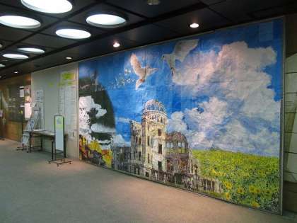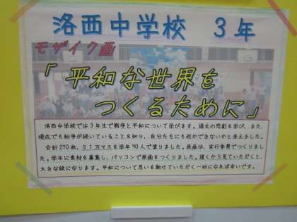 12月の人権月間に因んで,洛西支所では,毎年,区内の小・中学生による人権をテーマとした絵画や習字の作品展が開催されています。今年度は,12月6日(月)〜24日(金)まで開催されます。本校からは,3年生が平和学習で取り組んだ大モザイクアート「平和な世界をつくるために」を出品し,1階ロビーに展示していただきました。戦争は最大の人権侵害です。核兵器のない,紛争のない,本当に平和な世界をつくりたいと思って取り組んだ大モザイクアートを,ご覧いただければ幸いです。