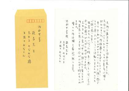 心温まるお手紙を頂戴し,誠に有り難うございました。このお手紙を生徒たちに伝え,励みにし,今後も頑張って参ります。地域の皆様には,引き続き,本校教育にご理解とご支援を賜りますようお願い申し上げます。