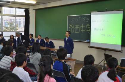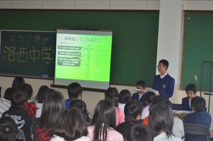 生徒会本部からの「洛西中の生活や1年間のようす」についての説明は、コンピュータ(パワーポイント)を使って、写真や動画を駆使し、おもしろおかしく話してくれたこともあり、小学生はとても楽しみながら、先輩である中学生の話に耳を傾けていました。