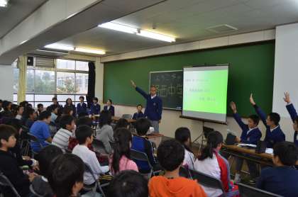 生徒会本部からの「洛西中の生活や1年間のようす」についての説明は、コンピュータ(パワーポイント)を使って、写真や動画を駆使し、おもしろおかしく話してくれたこともあり、小学生はとても楽しみながら、先輩である中学生の話に耳を傾けていました。