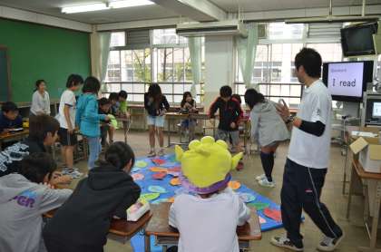 先生が「 I eat 」と発音したら、みんなはそれに続く単語が書かれた紙の魚を釣り上げ、その場で、例えば「 I eat apple 」といったように発音するゲーム形式の授業でした。