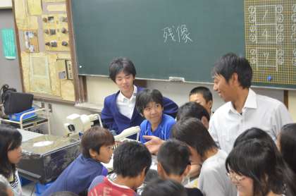 この場面は、「音を目で見てみよう」ということで、スピーカーの上に置かれたビーズが、音の振動で跳ねるようすを、みんなに前に集まってもらい、一緒に確認しました。