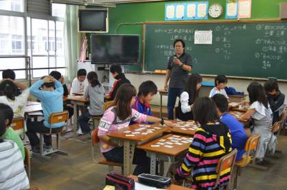 ひと通り、「都道府県」について勉強をした後、机を向かえ合わせにして、「都道府県かるた」で遊びながらの勉強となりました。
