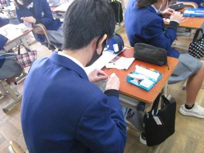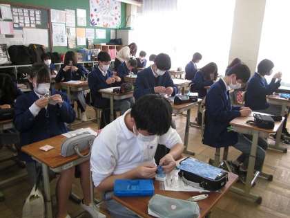 12月14日(火)3限,3年生家庭科の時間に,日本の伝統的な遊びであるお手玉作りに取り組んでいました。まずは枕型の作り方として,布地は長い方を中表に二つ折りにして,返し口を残して,周囲3辺を本返し縫いしていました。わかりにくいところは,先生に聞きながら,皆さん,頑張って取り組んでいました。