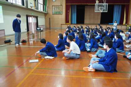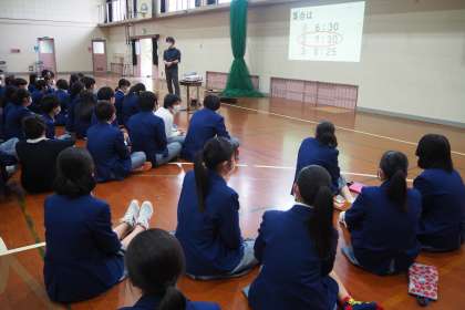 5月17日(火)6時間目,3年生は明日からの修学旅行に向けて,前日指導を行いました。体育館に集合し,校長先生が出張のため教頭先生からの一言の後,実行委員会総務部長の生徒からのあいさつがありました。学年の先生から諸注意に続き,旅行中の集合や点呼の仕方などの練習を行い,最後に学年主任の先生からの一言で,前日指導を終えました。