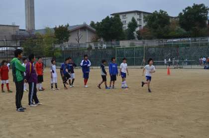 サッカー部です。シュート練習をしているところです。すでにサッカーに親しんでいる小学生もいて、「結構上手い!」と思う場面も…。時折、先生からの的確なアドバイスがとんでいました。
