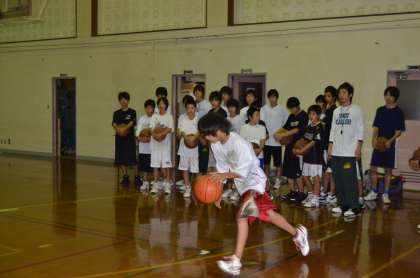 男子バスケットボール部です。シュート練習やパターン練習、実践的な試合形式の練習を行いました。先輩の見本がとても上手く華麗で、小学生も見とれていました。