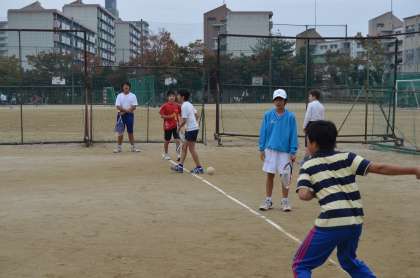 男子ソフトテニス部です。先輩だけでなく、先生自らも球出しをして小学生に打たしていました。先輩からの技術的なアドバイスもありました。