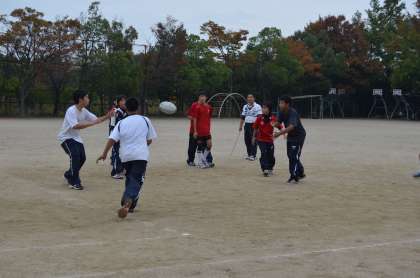 これはラグビー部です。少人数ですが、みんなで楽しく実践練習の中でボール回しをしていました。先輩の出す球は、まっすぐスクリューを描いて進み、さすがだと感じました。