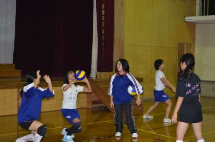 これは女子バレーボール部です。先輩の中学生がていねいに見本を示しながら、技術的なアドバイスを繰り返し、小学生に実際に動きをさせていました。