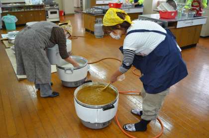 これは、朝早い段階でのご飯を炊いたり、できたカレーを温めたりしているときのようすです。PTAや地域のみなさん、「ありがとうございます」。