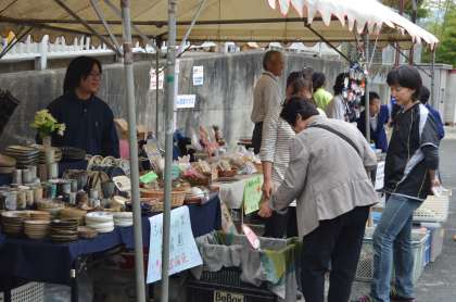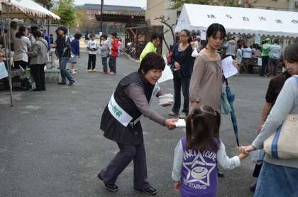 この写真は、保護司会によるティッシュ配りや福祉施設や園芸ボランティア(洛西中6組も一緒に)からの自主製品等の販売のようすです。