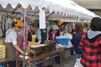 これは、たんぽぽハウス、境谷自治連・少年補導委員会、新林自治連による飲食物(みたらし団子やフランクフルト)の販売のようすです。