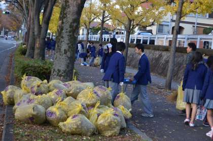 袋に集めた落ち葉は、このように歩道の脇にかためて置いて、各学年声をかけ合って学校へ戻りました。京都市の方で、まとめて回収をしていただけるそうです。ありがとうございます。