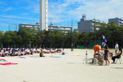 9月29日(木)3・4時間目に、来週実施する学校祭体育の部の予行練習を行いました。気温は高めでしたが、良いコンディションの中、久しぶりに全校生徒が一丸となって取り組みました。体育科の先生から今日の練習内容についての説明の後、体育委員長と各色別団長からあいさつがあり、開会式の練習を行いました。