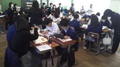 10月25日(火)午後に西京支部授業研究会が開催され,西京区の京都市立中学校および西総合支援学校の教員が,それぞれの教科に分かれ,各中学校を会場として教科指導力の向上と生徒一人ひとりの学力向上につながる授業づくりのために,公開授業と研究協議が行われました。西京支部の研究テーマ「資質・能力を育成できる授業づくり〜「個別最適な学び」「協同的な学び」を意識して〜」を取り入れた研究授業が西京支部の各校で実施され,本校は国語を2年1組で実施し,西京支部8校の国語科の先生方が授業を参観されました。