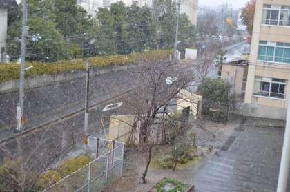 そのときの学校からの雪が激しく降っているようすです。寒そうですね。(本当に寒かったのですが…)
