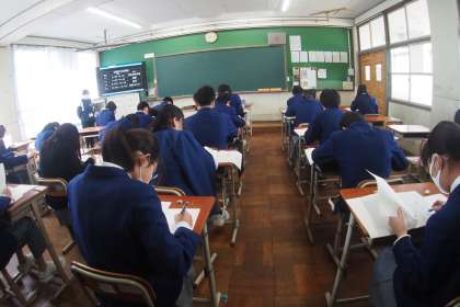 4月18日(火)、3年生は「全国学力・学習状況調査(全国学力テスト)」に取り組みました。この調査は、文部科学省が全国の中学3年生と小学6年生全員を対象に実施するもので、全国一斉に約205万人が参加して行われました。国語・数学・英語の3教科に加え、生徒の学習環境や生活環境のアンケート調査も実施されました。写真は1時間目の国語の様子で、みんな真剣に取り組んでいました。結果は、7月下旬に公表されますが、個人結果の返却は夏休み明けになります。