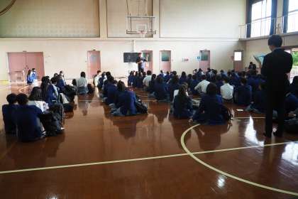 今日は、朝6時15分に学校集合。まずは、体育館で結団式を行いました。司会進行は実行委員生徒が行い、校長先生のあいさつ、同行してくださる添乗員さん、写真屋さんの紹介もありました。