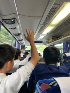 渋滞や事故もなくバスは順調に走り、予定より少し早く10時25分に、山陽自動車道・福山サービスエリアに到着しました。ここではトイレ休憩だけですが、青空が広がり気持ちよさそうです。バスの中では、実行委員会の生徒が企画したレクで盛り上がっています。