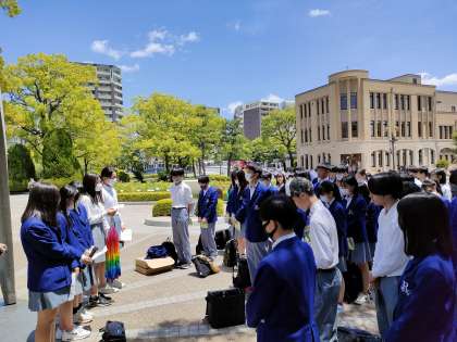 予定より早く、12時前に広島平和記念公園に到着しました。「原爆の子の像」の前に移動し、平和セレモニーを行いました。全体で黙とうを捧げたあと、「平和宣言」を行いました。原爆の子の像は、被爆10年後、白血病のため12歳でなくなった佐々木禎子さんの同級生らによる募金運動により作られた像です。像の下に置かれた石碑には、「これはぼくらの叫びです これは私たちの祈りです 世界に平和をきずくための」という碑文が刻まれています。