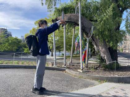 平和記念資料館を見学した後、生徒たちはグループに分かれ、広島市内の班別研修に出かけました。広島市内には色々な場所に千羽鶴があり、原爆の影響で折れた木にも千羽鶴があるそうです。班別研修のミッションである平和をイメージした写真として、体を使ってハートを作っている様子が送られてきました。班別研修は午後5時半までで、ホテルに集合することになっています。