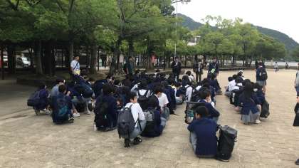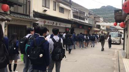 平清盛像前の広場にいったん集合しました。厳島神社まではみんな揃って移動します。厳島神社参拝のあとは、自由研修になります。まだ、9時過ぎなので、参道のお店も閉まっていますが、商店街の様子や集合場所など、しっかり見て迷わないようにしてくださいね。
